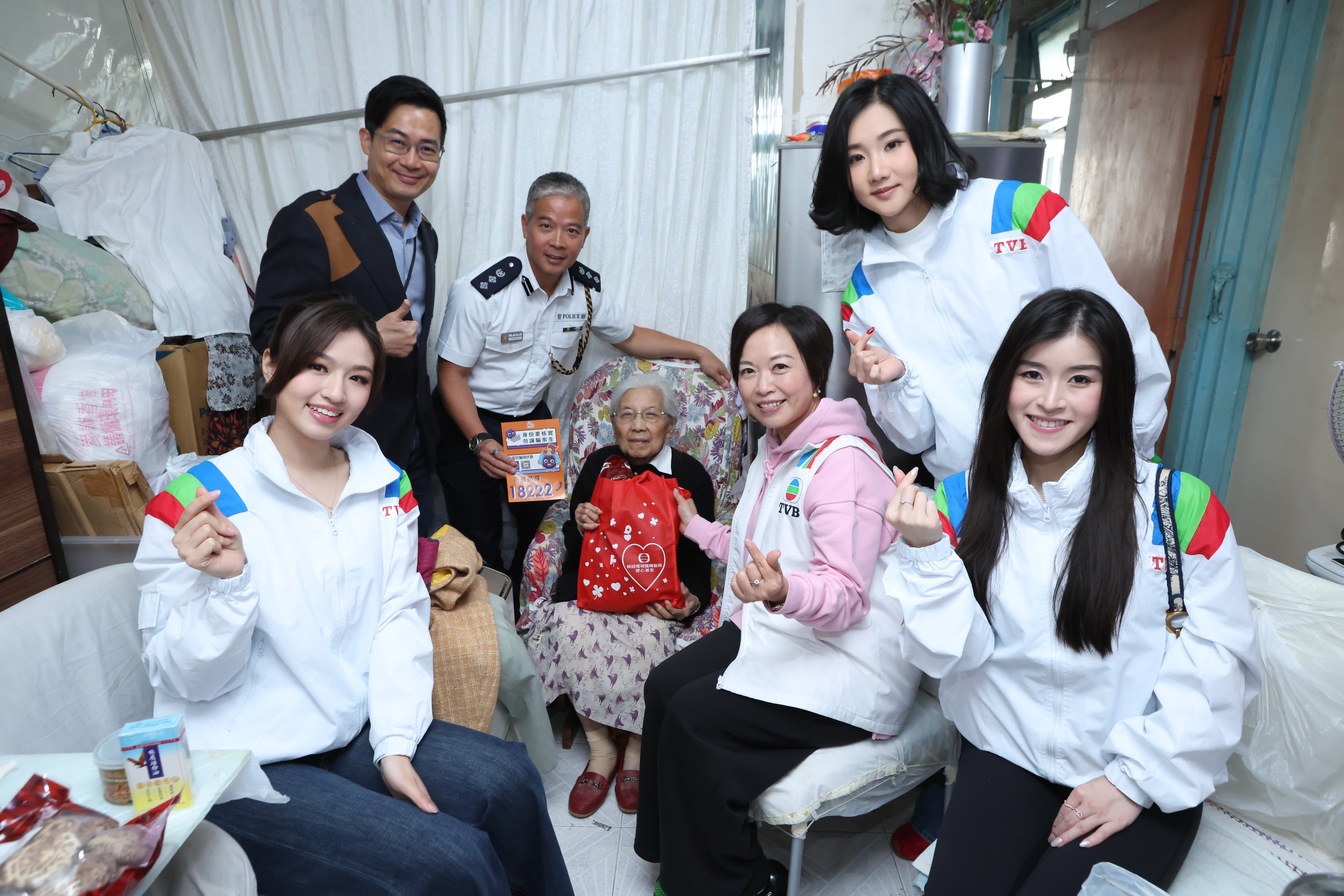 另一隊則由電視廣播有限公司新聞總監兼無綫電視愛心義工隊主席黃淑明、將軍澳警區指揮官麥文禹總警司、應屆香港小姐陳詠詩、袁文靜、李尹嫣、曾閱遙、岳凡荻以及一眾TVB義工共同組成,專程前往將軍澳區進行上門探訪並派發福袋,將暖心祝福送給老友記。