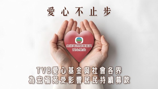 TVB愛心基金繼2025年11月28日緊急撥出港幣100萬元的善款外再度支援受影響的宏福苑居民,這份捐款亦將全數捐予由特區政府成立的「大埔宏福苑援助基金」。 特別感謝我們的員工餐廳「群力飲食有限公司」和Café Corner「逸通發展有限公司」於12月1日將當日所有收益(未扣除任何成本)捐出。